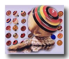 『御前、証文入れるくらいの気持ちで独楽廻しの勝負をやるか』という意味があると言われております。 『佐世保こま』は『けんかごま』とも呼ばれ、互いにこまを打ち合い相手のこまを打ち割って負かす勇壮な遊びで、 長く廻り続けた方が勝者となります。 この佐世保こまは全国でも形状の優美さと異国情緒豊かな色彩が独特で珍しいこまとして定評があります。 『ラッキョウ型』の形状は台湾・印度の系図をひき先進地の南方より中国の唐を経て長崎へ渡来したものと言われております。 又、遊び言葉が豊富で全国随一と思われます。《対(つい)、生(なま)、天下一、こぐ、こっけんころり、他》 色彩については、中国古代思想の『陰陽五行説』に影響され、青(緑)、赤、黄、白(生地の色)、黒、の五色の色を使い、 各色にも意味が有るといわれております。 こまの足端には、剣(けん)と呼ぶ鉄を打ち付けます。 何故、剣(つるぎ)の剣(けん)と呼ぶのかは、その鉄の部分の面が剣(つるぎ)の面と同じく八面体になっているからで、 形状からも勇壮な遊びが故にその名前が付けられたものと思われます。 昔より玩具として作られている殆どの物は、その地にありその遊びに一番適した素材を使うということで、 佐世保こまは、ブナ科のマテバシイ(硬くて重く打ち合うのに適しており、地元に群生している)という木を使い 他に民芸品の材料としては、桜、椿、子安、クロキなど木肌が美しいものを今では使っております。 佐世保独楽は、昭和24年昭和天皇御巡行のおり、献上品として今までの玩具から民芸品としての、苦心の創作がはじまりました。 同年6月、通産省の輸出視察として来られた米国の著名デザイナー、ケラー女史に、日本を代表する民芸品と賞賛され、 我国ではじめて、米国へ2点出品される玩具の部の1点としてニューヨークへ出品され、世界の市場へひろげられました。 佐世保独楽は、佐世保独楽本舗で制作された独楽の商品名です。 尚、佐世保独楽は、長崎県伝統的工芸品に指定されており、200種類を超える独楽を制作しております。